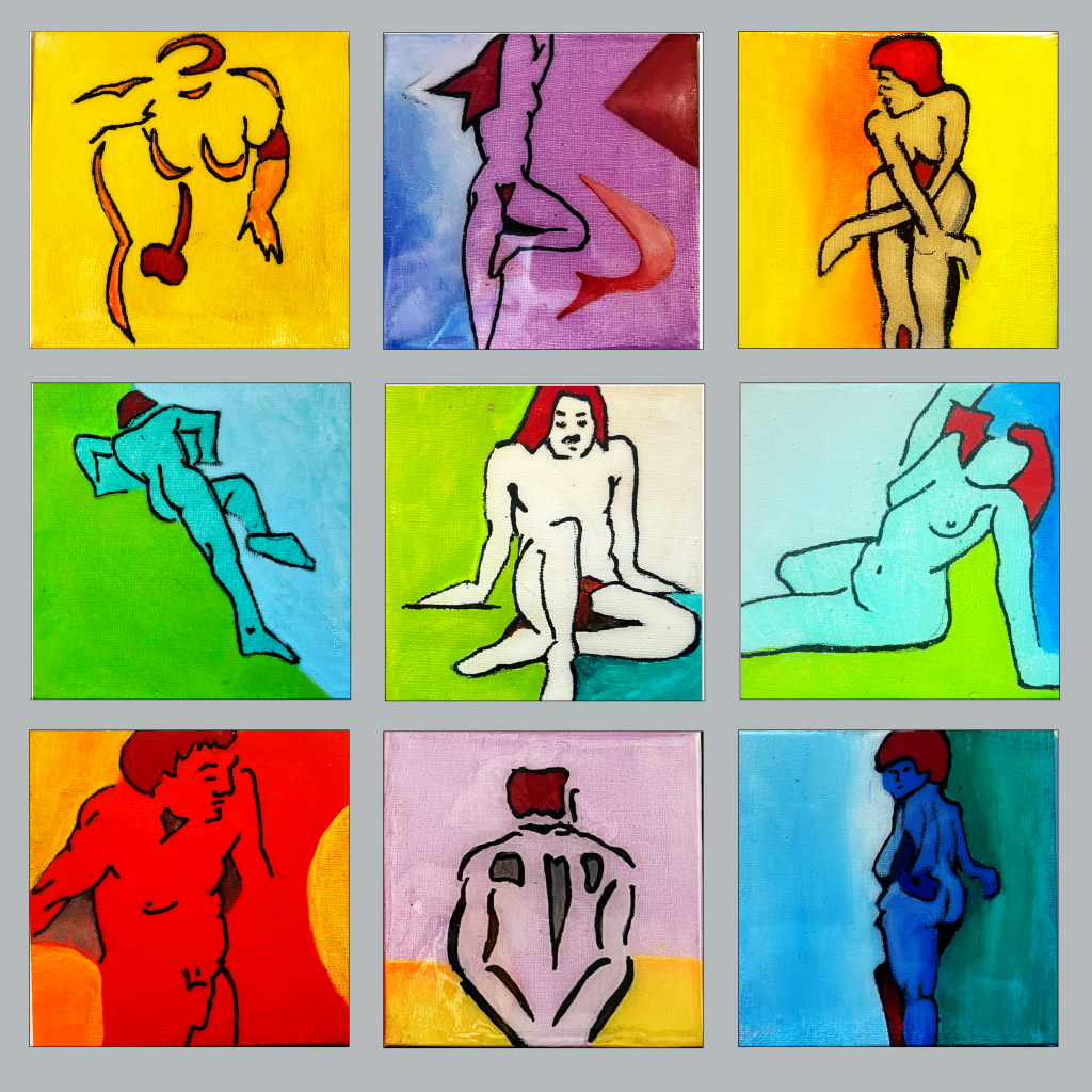Skizzen aus Zeichen Sessions verschiedener Jahre, in reduzierter Form auf kleine Leinwände übertragen und mit Harz grob abgedeckt.